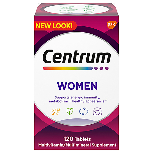 Centrum Multivitamin for Women is a complete multivitamin/multimineral supplement specially formulated for women with B Vitamins to help support energy and metabolism and Antioxidant Vitamins C and E to support immunity (1). This multivitamin with iron for women contains 23 key micronutrients and other important nutrients to help support your body head-to-toe (1). These vitamin supplements contain B Vitamins to help support daily energy levels and to assist in the body's metabolism of macronutrients, Antioxidant Vitamins C and E for immune support, and biotin and Vitamins A, C and E to help maintain a healthy appearance (1). Each Centrum women's multivitamin with iron contains 100 percent or more of the daily value of iron, biotin and Vitamin D3, Vitamin B6 and Vitamin B12, as well as Vitamin A and Vitamin E. Centrum women's vitamin tablets are Non-GMO (2) and gluten free to meet a variety of dietary needs. These multivitamin tablets feature a smooth coating that makes them easy to swallow. With 120 tablets per bottle, it's easy to maintain your overall health by taking one women's daily multivitamin tablet with food. Help support full body wellness with Centrum, the #1 doctor and pharmacist recommended brand.(1) These statements have not been evaluated by the Food and Drug Administration. This product is not intended to diagnose, treat, cure or prevent any disease.(2) Non-GMO applies to Centrum and Centrum Silver tablets only; learn more at Centrum's official website