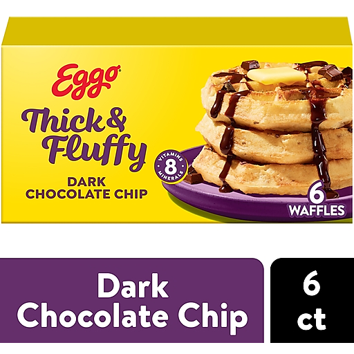 Wake up and greet the day with the feel-good taste of Eggo Thick and Fluffy Dark Chocolate Chip waffles. Crafted with delicious ingredients, our waffles are a perfect balance of crispy, fluffy goodness. Convenient and easy to prepare, Eggo Thick and Fluffy waffles bring warmth to busy mornings. With colors and flavors from natural sources, our waffles also provide a good source of 8 vitamins and minerals; Great for families and individuals, these rich waffles are made to enjoy as a stand-alone breakfast treat. Enjoy them with your favorite morning toppings like butter and syrup, jellies and preserves, and whipped cream. Thinking of taking a turn for the savory? Go ahead and try them with fried chicken, bacon, or sausage, or combine for a tasty waffle sandwich. The scrumptious possibilities are endless. They're just so delicious, why would you L'Eggo your Eggo?