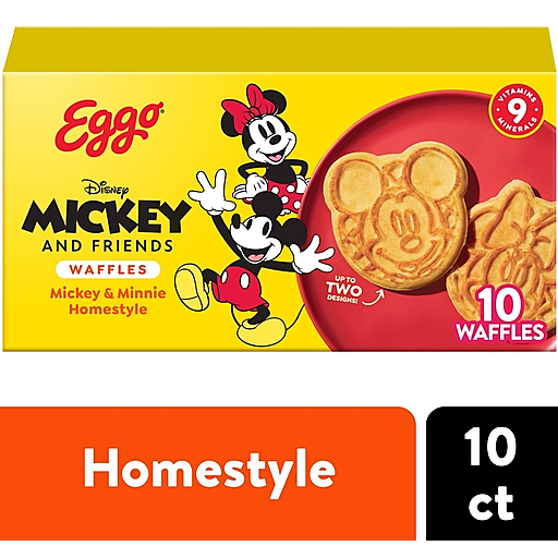 Wake up and greet the day with the feel-good taste of Disney's Mickey and Friends Eggo Homestyle waffles. Crafted with delicious ingredients, our waffles are a perfect balance of crispy, fluffy goodness. Convenient and easy to prepare, Disney's Mickey and Friends Eggo Homestyle waffles bring warmth to busy mornings. This quick part of breakfast is made with no artificial colors or flavors and provides a good source of 9 vitamins and minerals; These waffles help bring warmth and smiles to a fast-paced, busy morning or make a great addition to a relaxed weekend brunch. They've been filling kitchens with sweet aromas and warm memories for decades. Great for families and individuals, these tasty waffles are made to enjoy as a stand-alone breakfast treat. Try them with your favorite morning toppings like butter and syrup, jellies and preserves, and whipped cream. They're just so delicious, why would you L'Eggo your Eggo?
