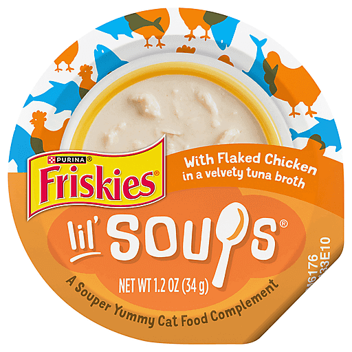 Surprise your adult cat between meals by offering her the yummy snack she craves in each cup of Purina Friskies Lil' Soups With Flaked Chicken in a Velvety Tuna Broth adult wet cat food complement. Made with real, high-quality ingredients, including real chicken, this mouthwatering complement is brimming with the delicious taste cats love. A silky tuna broth adds moisture and whisker-licking scrumptiousness to each bite. Intended as a complement to your cat's complete and balanced diet, this grain-free complement is purrfect as an anytime snack or a flavorful addition to her everyday meals. We craft this delectable wet cat food complement without artificial colors, flavors or preservatives, and it's free of animal by-products. Friskies Lil' Soups are packaged in convenient cups to make it easy for you to share a special moment with your playful feline friend.