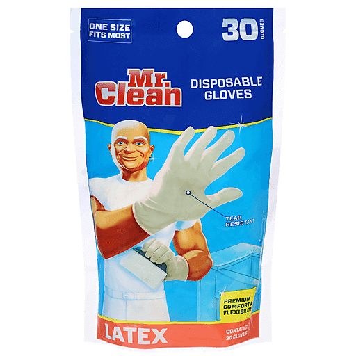 Mr. Clean® Latex Disposable Gloves One Size Fits All. Beaded cuff. Lightly powdered. For ultimate dexterity. Great fit.
