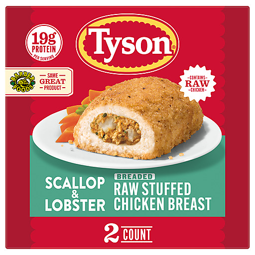 For a delicious entree that is easy to prepare, Tyson Breaded Raw Stuffed Chicken Breasts Scallop and Lobster are perfect for any night of the week. We start with a combination of scallops and lobster meat, wrap it all in savory, boneless chicken and add crispy golden brown breading. With 19 grams of protein per serving, these frozen stuffed chicken breasts with rib meat are easy to prepare in the oven. For a tasty meal the whole family will enjoy, prepare and serve with a side of roasted vegetables. Includes 2 individually wrapped breaded raw stuffed chicken breasts scallop and lobster. Bring Tyson stuffed chicken to the table tonight and you’ll find it’s an instant family favorite that’s perfect for every night of the week.